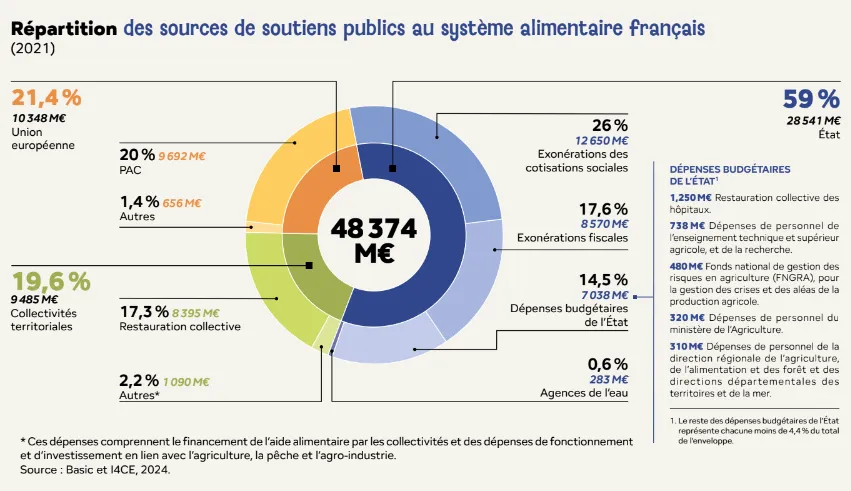Le rapport met également en lumière les subventions massives dont bénéficie le système agroalimentaire : 48,3 milliards d’euros par an, répartis entre exonérations fiscales, aides directes et achats publics. Toutefois, plus de 80 % de ces soutiens profitent à un modèle industriel axé sur la production de masse, aux dépens de l'environnement et des petits producteurs.