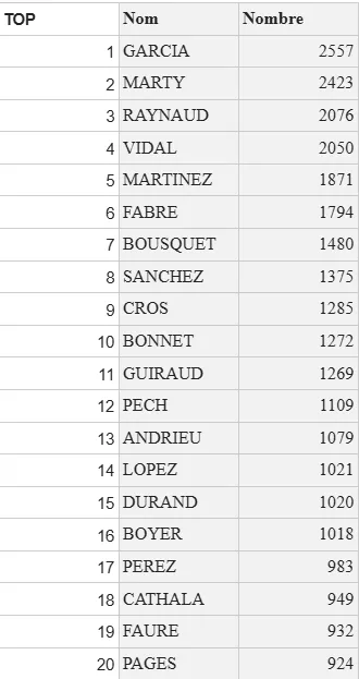 Dans l'Aude, le classement bouscule les habitudes nationales. Ici, pas de "Martin" sur le podium ! C’est le patronyme Garcia qui s'installe à la première place, illustrant la proximité et l'histoire commune avec l'Espagne.