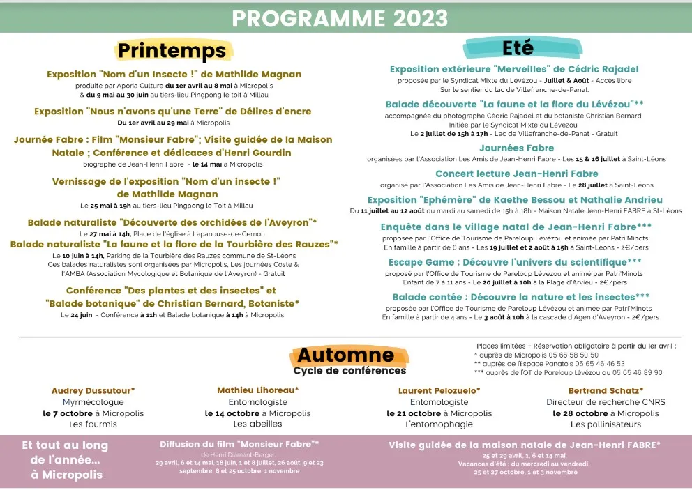 Pour célébrer le bicentenaire de Jean-Henri-Fabre, devenu l’un des plus grands naturalistes de tous les temps, Micropolis, le Syndicat Mixte du Lévézou, l’office de tourisme Pareloup-Lévézou et l’association des Amis de Jean-Henri Fabre proposent tout au long de l’année une programmation spéciale dans le parc, mais aussi sur le territoire. Un grand événement puisque l’implantation de Micropolis à Saint-Léons, depuis 2000, est un hommage au célèbre entomologiste, né dans la commune le 21 décembre 1823.