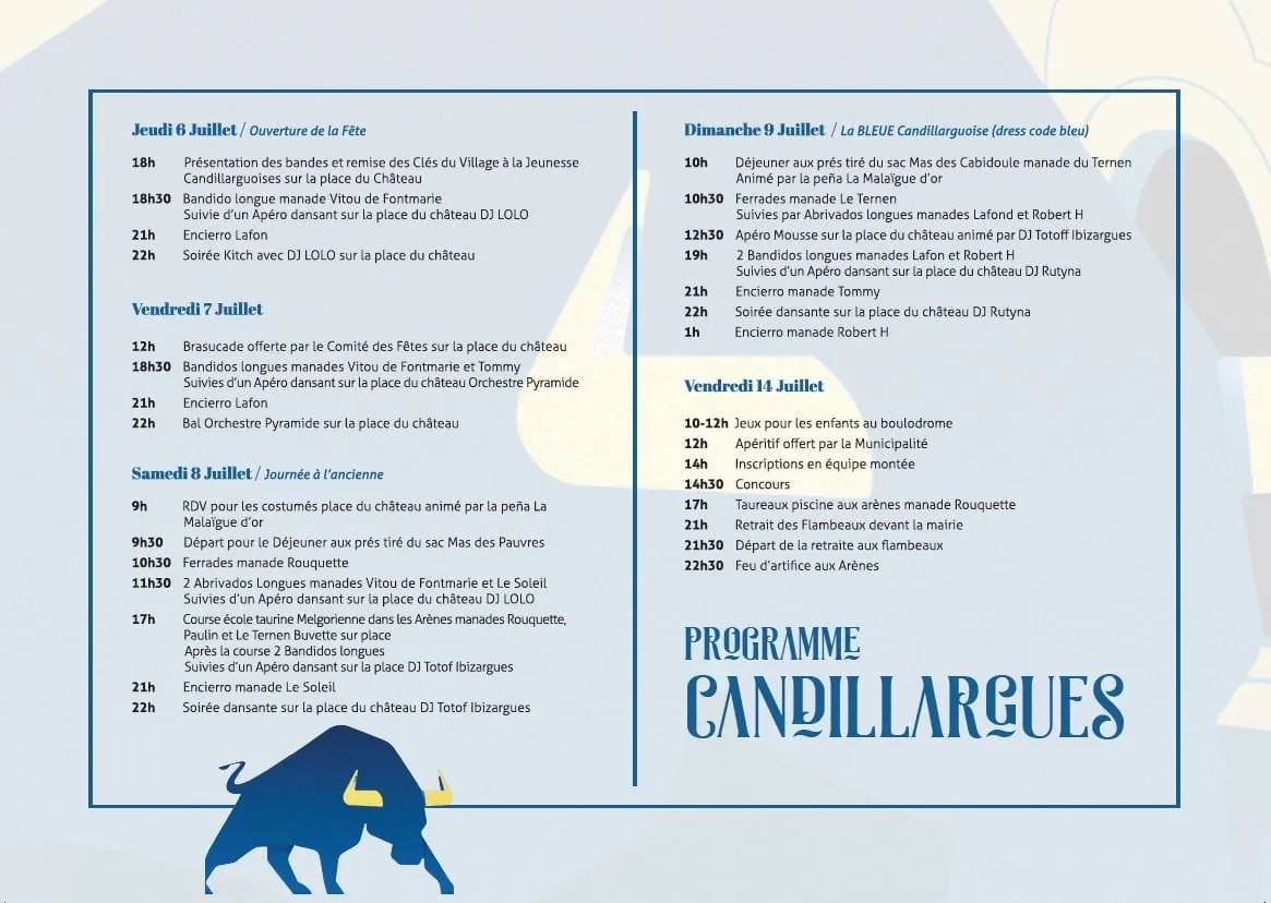 La fête de Candillargues est un rendez-vous annuel qui se déroule cette année du 6 au 9 juillet. L'essentiel du programme est bien sûr axé sur les traditions taurines. Les taureaux, les abrivades, les ferrades et les courses camarguaises font partie intégrante de ces festivités. Mais la fête ne se limite pas qu'aux taureaux, elle propose également des événements conviviaux, tels que des bals, des apéros musicaux avec orchestre, des penas et des DJ. Cette année, des manèges seront aussi installés dans le village. Top départ des festivités le jeudi 6 juillet à 18h avec l'ouverture de la fête.