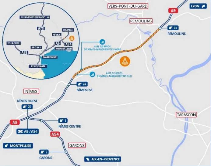 Les travaux sur cette portion située à l’est de Nîmes dureront 3 mois. Au total, 32 kilomètres de chaussée seront rénovés (16 km par sens).
