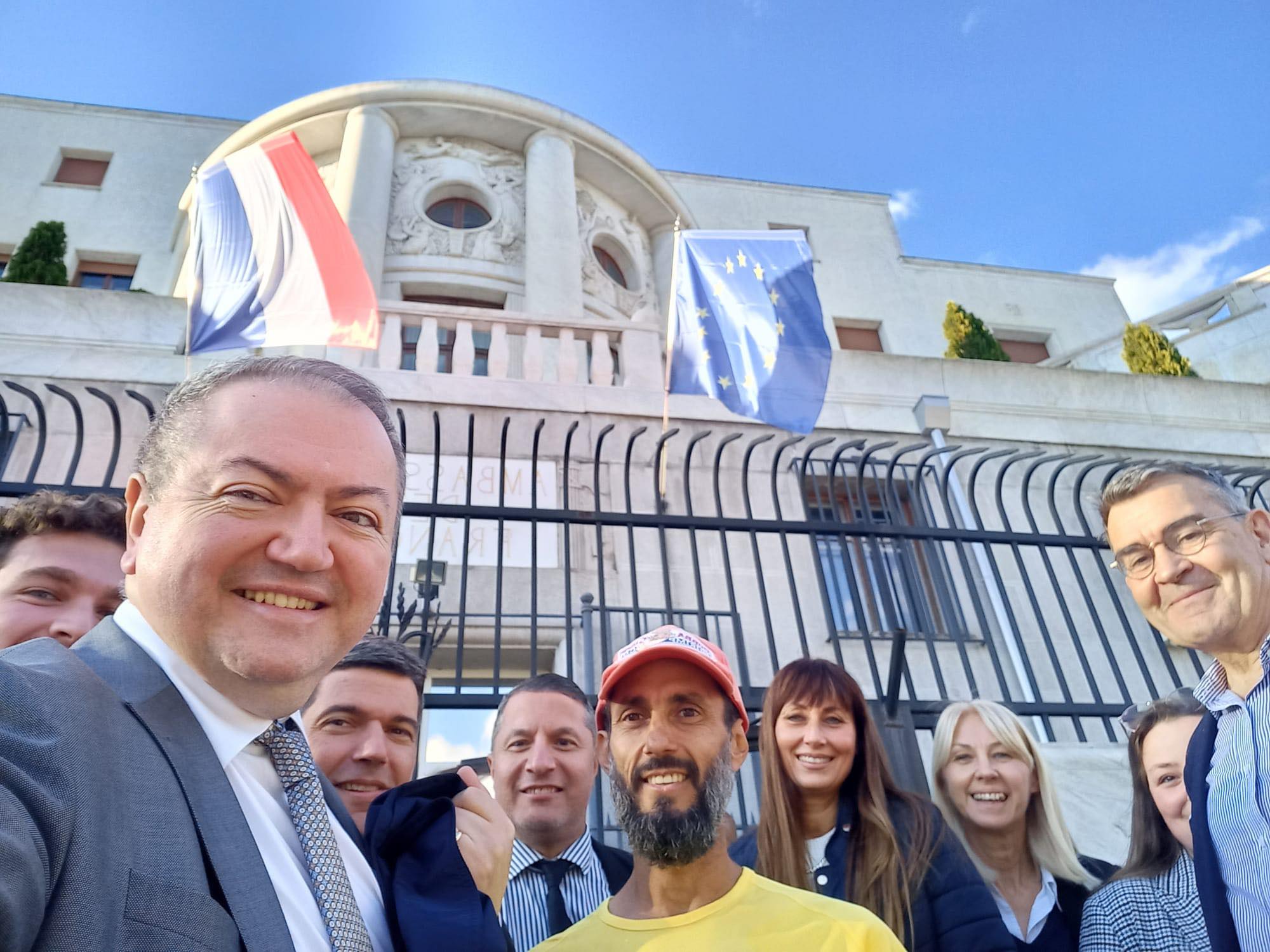 Photo devant l'ambassade de France, à Belgrade en Serbie.