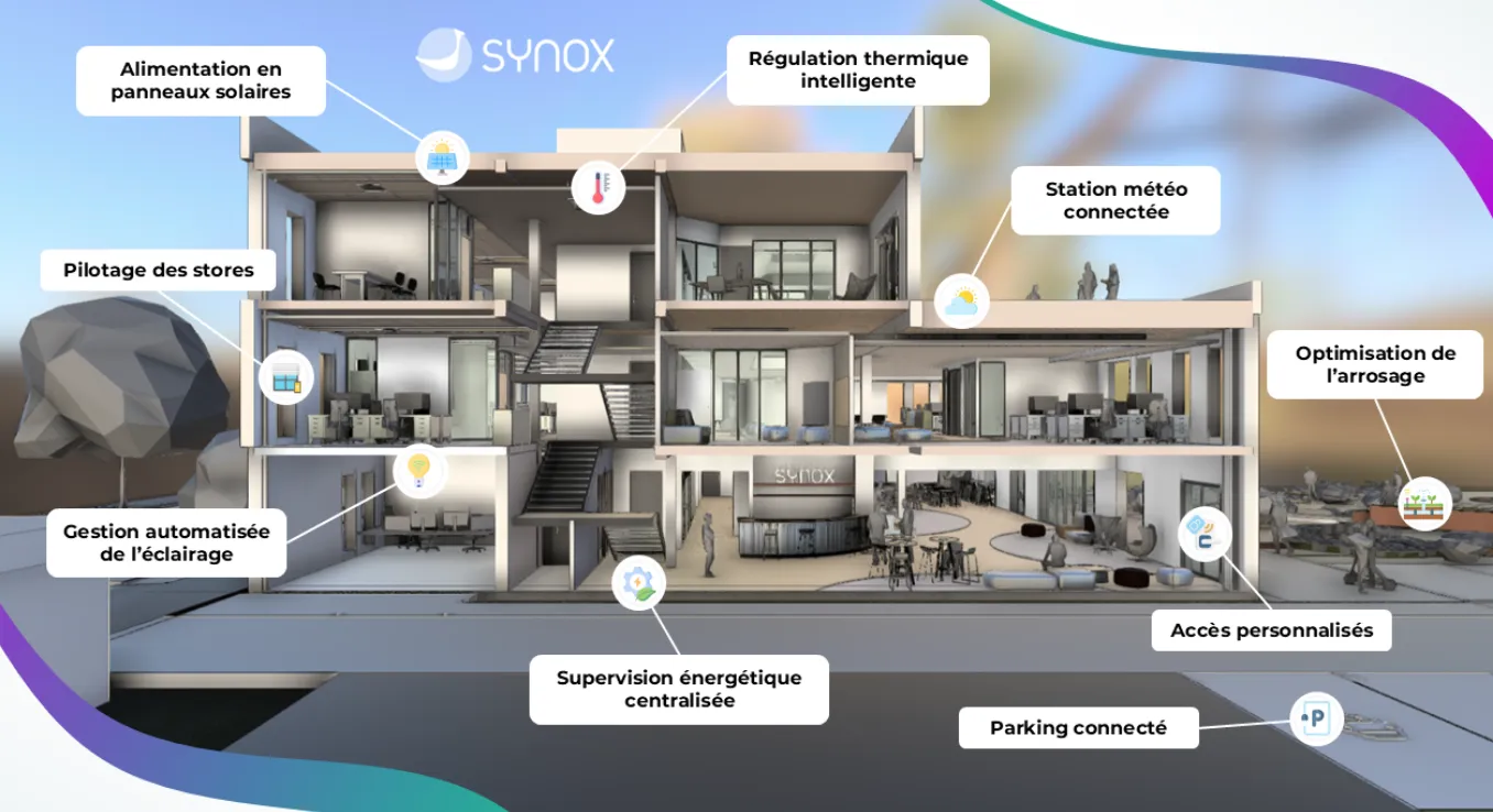 « Avec notre forte croissance, nous avions besoin de place. Alors, quoi de mieux qu’un nouveau bâtiment connecté pour illustrer tout ce dont nous sommes capables de faire dans le Smart Building ! » affirme Emmanuel Mouton CEO de Synox . Cette nouvelle infrastructure se veut une vitrine des capacités de Synox en matière de technologies IoT, permettant de déployer divers cas d'usages et capteurs tout en maîtrisant la chaîne de valeur.