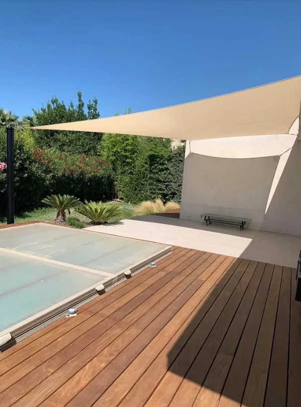 Depuis une quinzaine d'années, nous avons diversifié notre activité en devenant fabricants de voiles d'ombrage. Nous prenons en charge la prise de mesure, la confection et la pose de ces voiles sur-mesure. Nous proposons différents types de toiles adaptées à la forme de la maison et nous nous occupons du projet de A à Z. La voile d'ombrage est devenue une alternative intéressante pour les personnes qui souhaitent protéger leur espace extérieur de manière esthétique et fonctionnelle.