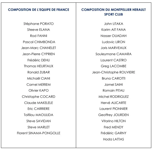 Les supporters auront ainsi l'occasion de voir s'affronter ex internationaux français et ex joueurs vedettes du MHSC, dans une ambiance conviviale et passionnée. Pour les bleus : Porato, Elana, Fanni, Chimbonda, Chanelet, Cyprien, Dehu, Heurtaux, Meriem, Martins, Kapo, Cocard, Carrière, Makélélé, Maoulida, Savidan, Marlet et Sinama-Pongolle et bien d’autres. Tandis que le MHSC sera représenté par de nombreux joueurs ayant évolué au club ces vingt dernières années, notamment plusieurs champions de France 2012 tels que Ait Fana, Pionner, Utaka, Saihi, Camara et Hilton.