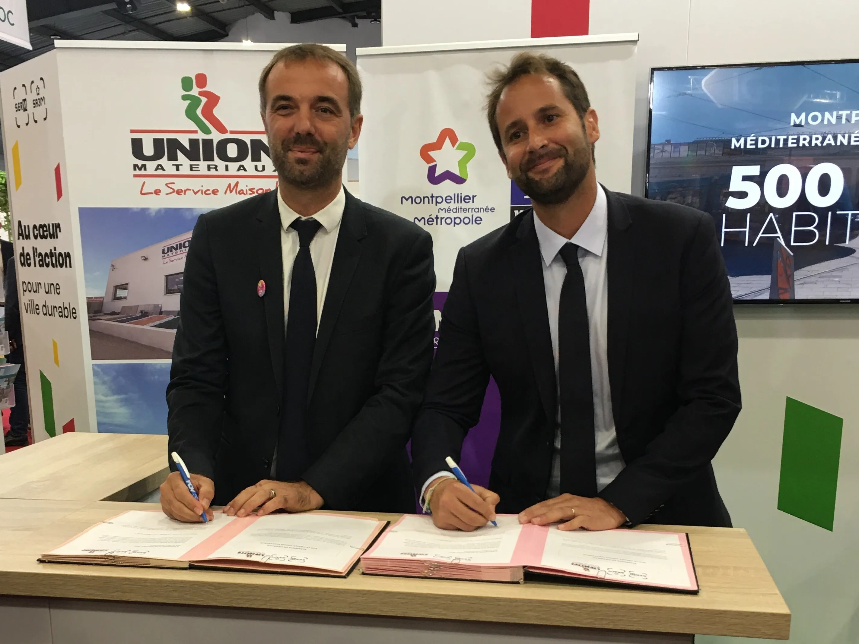 Michaël DELAFOSSE (Maire de Montpellier et Président de la Métropole) et Alexandre VACHET (Président d’UNION-MATERIAUX), au salon de l'immobilier.