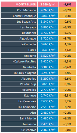 - Port Marianne reste le quartier le plus cher de Montpellier avec 4 260 €/m², quasi stable (+0,2 %).