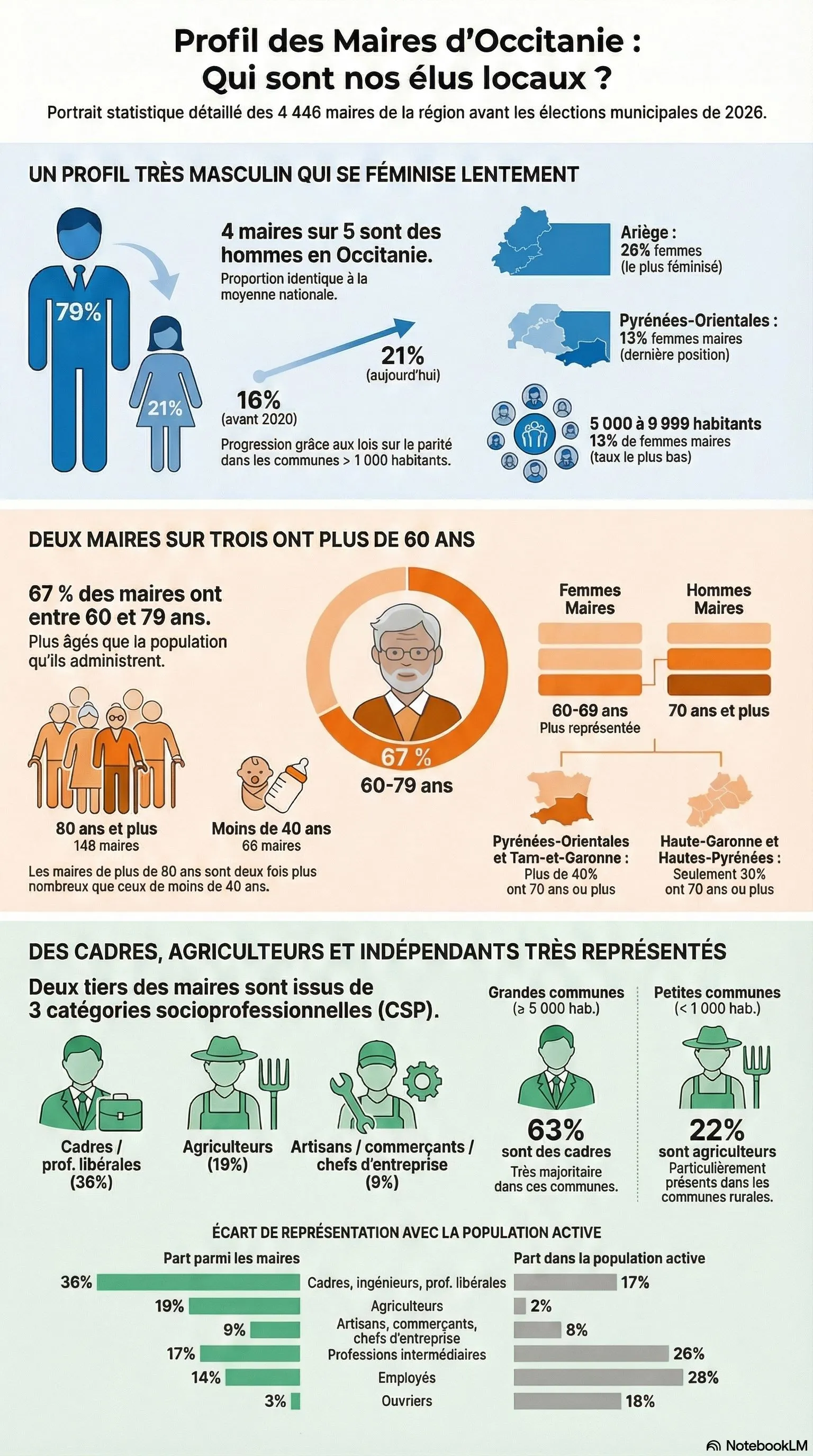 Avec la nouvelle année démarre également le compte à rebours pour les élections municipales de 2026, prévues les 15 et 22 mars prochains. Avant de se rendre aux urnes, une étude récente de l’Insee dresse le portrait des maires des 4 446 communes d’Occitanie, révélant quelques tendances marquantes.