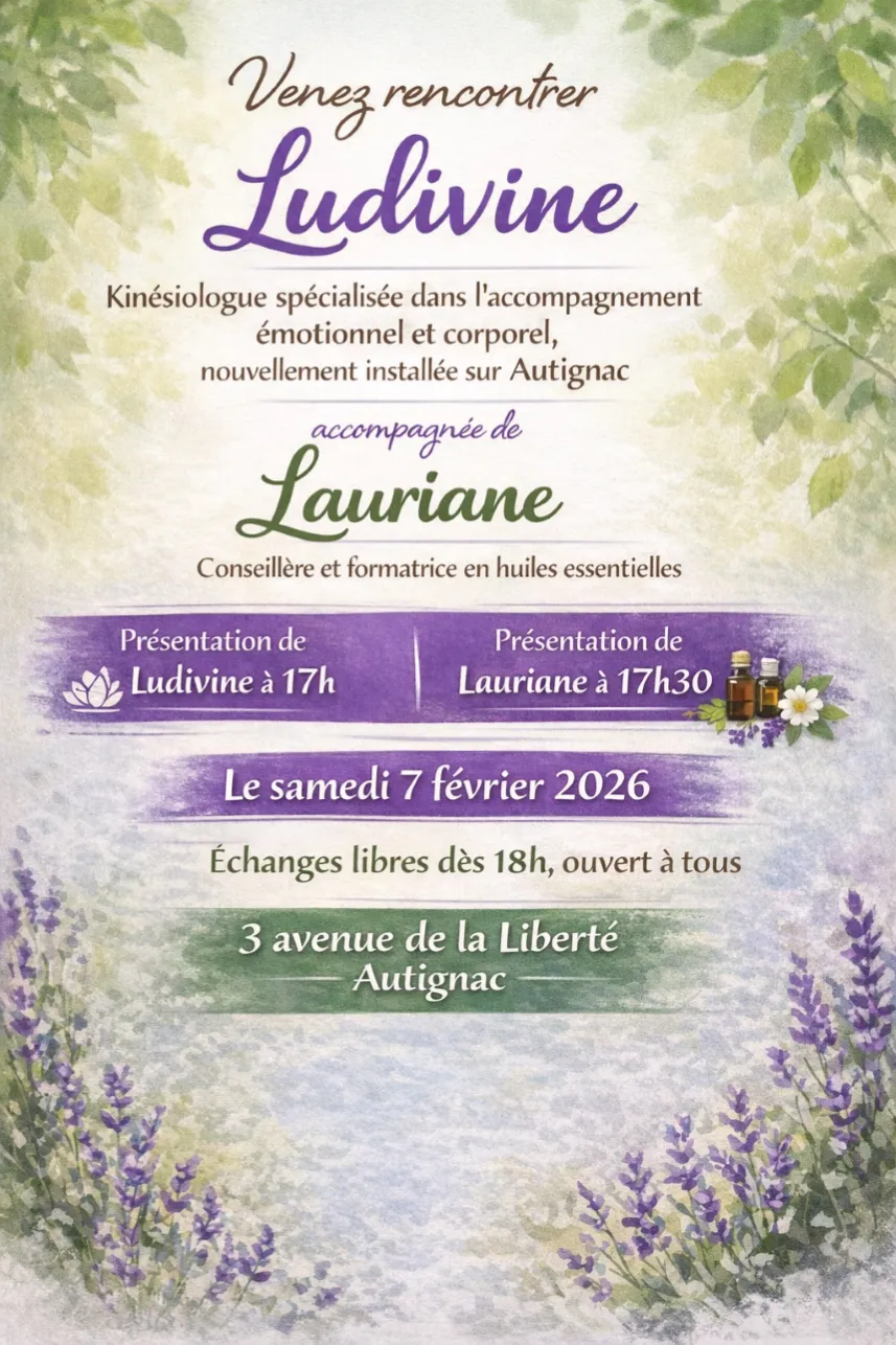 À l’occasion de son installation à Autignac, Ludivine Mazurier, kinésiologue spécialisée en accompagnement émotionnel et corporel, organise une rencontre ouverte au public le samedi 7 février 2026, de 17h à 19h, au 3 avenue de la Liberté.