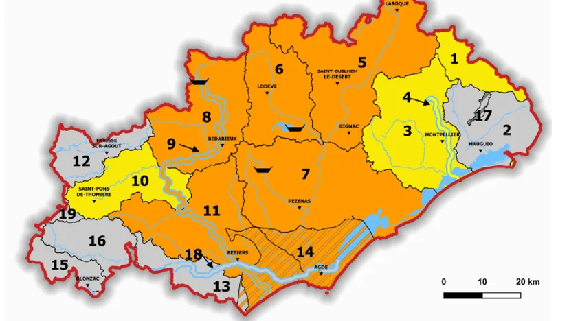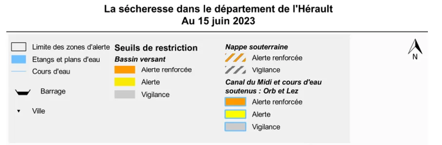 Au regard de ces éléments et des prévisions météorologiques à court terme, le préfet de l’Hérault a décidé de maintenir en alerte renforcée les bassins-versants de l’Hérault, de la Lergue, de l’Orb (de l’amont à l’aval, y compris son axe soutenu), ainsi que de la nappe astienne. Les Bassins Versant du Jaur et du Vidourle sont rétrogradés en état d’alerte, au même niveau que le bassin-versant de la Mosson et du Lez. Dans toutes ces zones (qu’elles soient en orange ou en jaune sur la carte ci-dessous), le remplissage des piscines (sauf exceptions) et le lavage des véhicules en dehors des stations sont notamment interdits. Ailleurs, la situation est peu moins pire sur quelques territoires, qui sont "seulement" en état de vigilance.