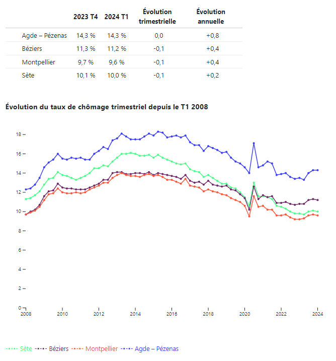 Cette philosophie semble payé d'après les derniers chiffres de la Dreets Occitanie le chomage est stable sur 1 an. Au premier trimestre 2024 il était de 10%. Ce qu'a précisé le maire: « J'ai fait un petit point sur l'évolution du taux de chômage, qui à une certaine époque était de l'ordre de 15,4%, me semble-t-il, actuellement il est tombé à 10%, on espère être à 9% en 2026. »