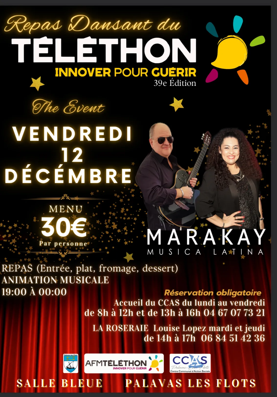 Pour compléter cette soirée, le groupe Marrakaï Bianca et Carlos enflammera la salle avec une ambiance latino festive, idéale pour danser et partager la joie de se retrouver pour une bonne cause. Cette soirée est organisée pour soutenir l’AFM-Téléthon et mettre à l’honneur Marie-Claude Nougaret, adjointe au CCAS de Palavas-les-Flots, qui porte cet événement avec enthousiasme et engagement.