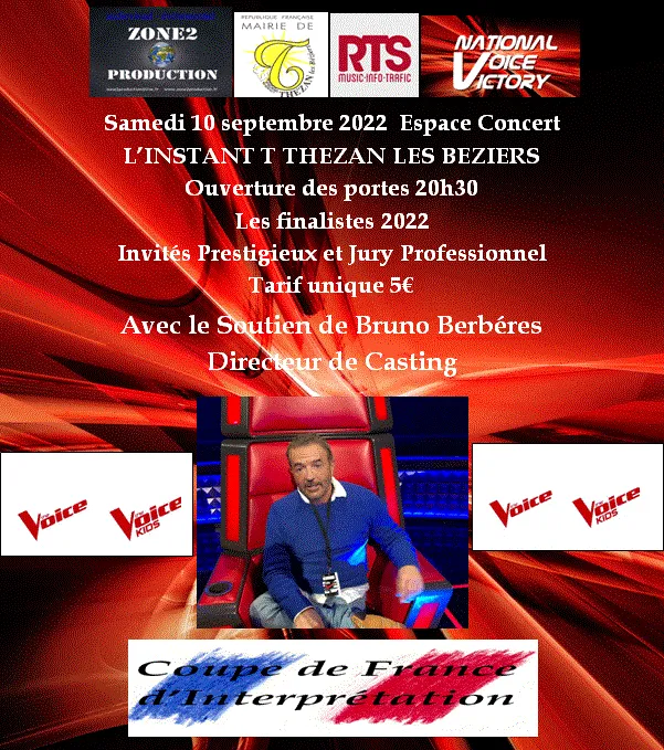 L'événement samedi soir à l’instant T à Thézan-lès-Béziers : 19 interprètes, tous lauréats de concours, et pour certains vus sur The Voice ou The Voice Kids, vont se disputer la Coupe de France d'interprétation, ou National Voice Victory. “Le niveau sera haut” promet le directeur artistique de l’événement Robert Molinier.