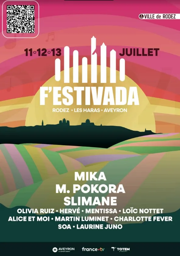 Le F’Estivada 2024, festival de musique incontournable, se tiendra du 11 au 13 juillet aux Haras de Rodez, Aveyron. Avec des artistes tels que Mika, Slimane, M Pokora, Olivia Ruiz. Le festival vise à attirer 10 000 festivaliers chaque soir.
